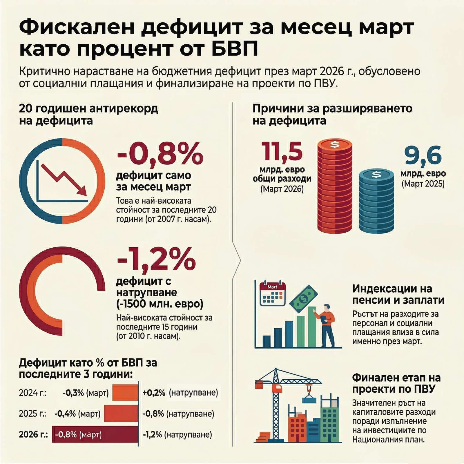 Причина за рязкото нарастване на дефицита са разходите по консолидираната фискална програма (вкл. вноската на Република България в бюджета на ЕС), които към март 2026 г. са в размер на 11,5 млрд. евро. За сравнение, разходите по КФП към март 2025 г. бяха в размер на 9,6 млрд. евро. Нарастване на разходите има основно при социалните и здравноосигурителните плащания, включително разходите за пенсии, както и при разходите за персонал, капиталовите разходи и други. Нарастването на разходите за персонал и пенсиите се дължи на индексации, които влизат в сила през месец март. Капиталовите разходи също отчитат значителен ръст, основно поради по-високите разходи във финалния етап на изпълнение на инвестициите по Националния план за възстановяване и устойчивост.