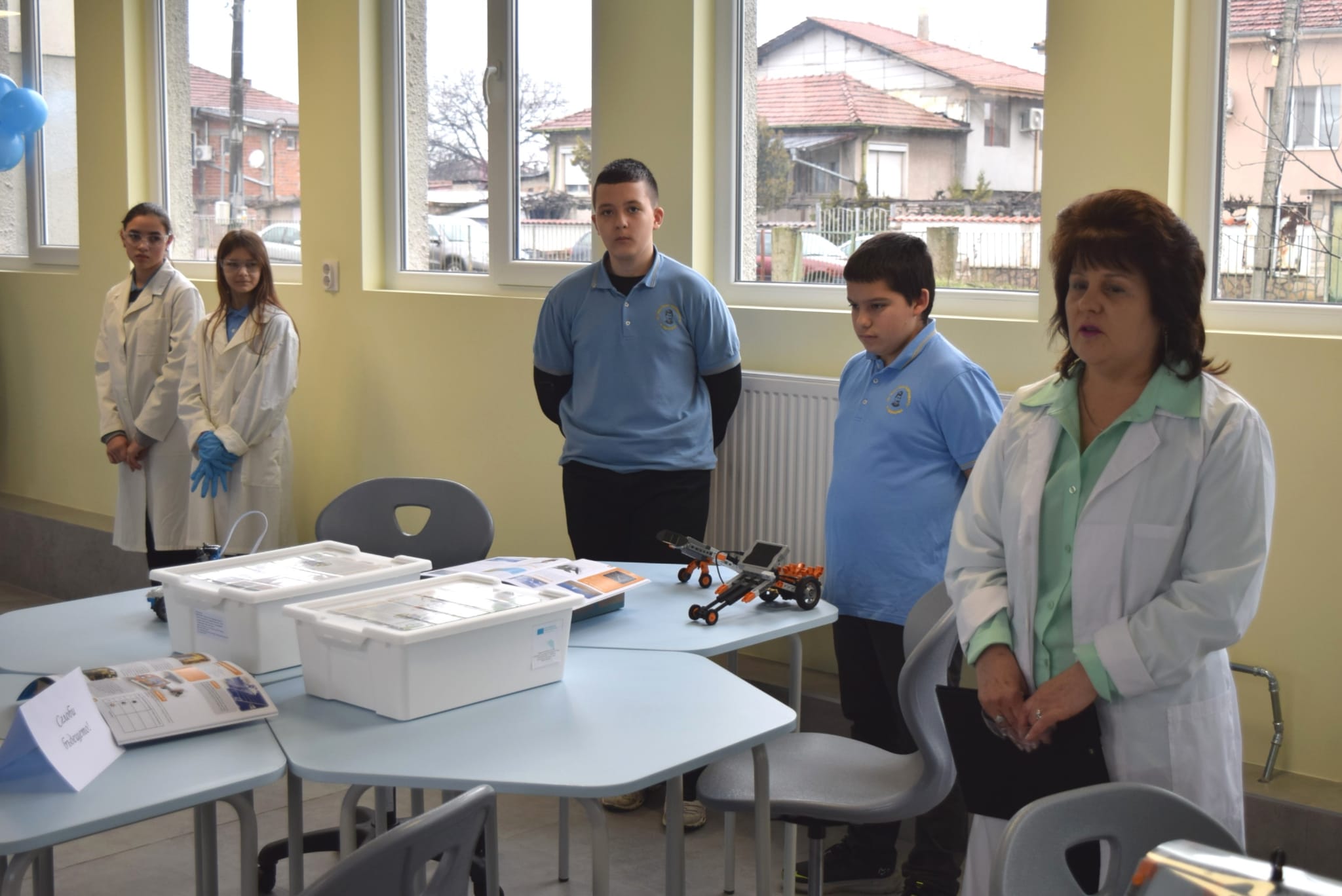 След това ученици демонстрираха част от възможностите на новия център. Младите лаборантки Ванеса и Елка представиха химичен експеримент, при който чрез смесване на сода и киселина се отделя въглероден диоксид. Калоян показа възможностите на дигитален микроскоп от ново поколение при изследване на различни материали, а бъдещите инженери Никола и Марти демонстрираха добиване на енергия от различни източници, включително приложението на слънчевата енергия чрез соларни панели, които могат да задвижват модели на превозни средства и самолети – символ на „автомобилите на бъдещето“.